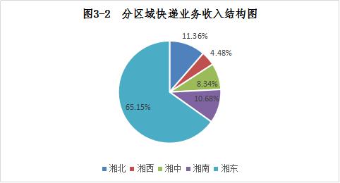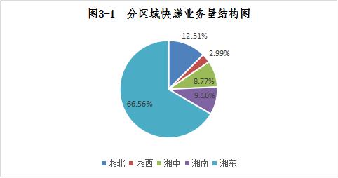 1-9月,湘北(岳阳、常德、益阳)、湘西(湘西州、怀化、张家界)、湘中(娄底,邵阳,湘潭)、湘南(衡阳,郴州,永州)、湘东(长沙、株洲)地区快递业务量比重分别为12.51%、2.99%、8.77%、9.16%、66.56%;快递业务收入比重分别为11.36%、4.48%、8.34%、10.68%、65.15%。